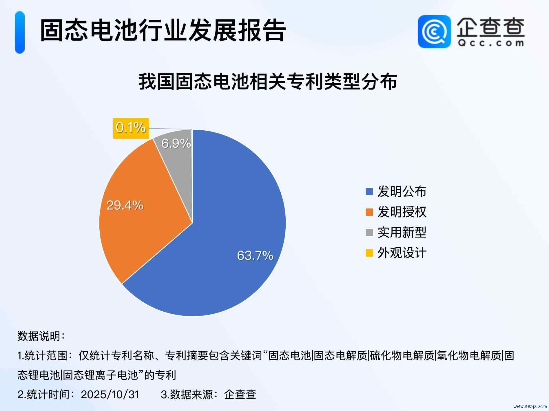 企查查数据显现,落幕10月31日,我国固态电板关连专利请求量达1.3万项,类型上以发明专利为主,占比超九成,其中发明公布占比63.7%,发明授权占比29.4%;外不雅遐想类占比最少,为0.1%。