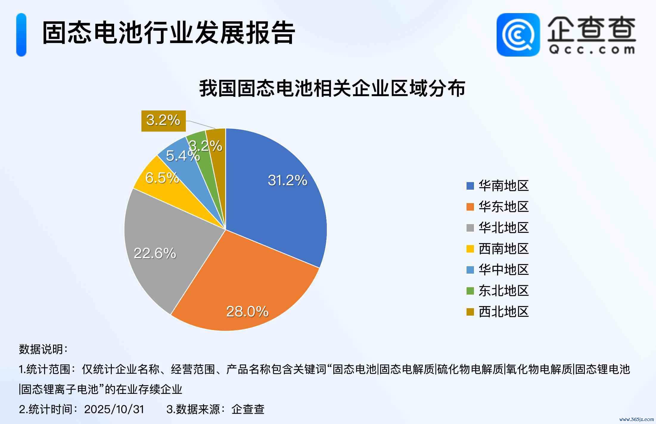 企查查数据显现,区域散布上,我国固态电板关连企业齐集华南、华东地区,狡计占比近六成,其中华南地区最多,占比31.2%。东北、西北地区固态电板关连企业占比拟少,均为3.2%。